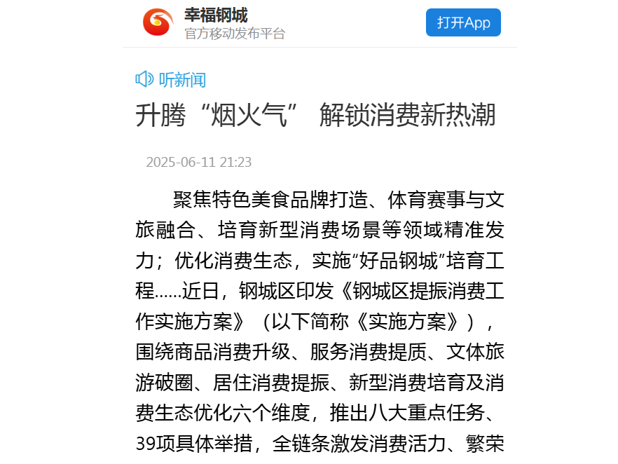 聚焦特色美食品牌打造、体育赛事与文旅融合、培育新型消费场景等领域精准发力;优化消费生态,实施“好品钢城”培育工程……近日,钢城区印发《钢城区提振消费工作实施方案》(以下简称《实施方案》),围绕商品消费升级、服务消费提质、文体旅游破圈、居住消费提振、新型消费培育及消费生态优化六个维度,推出八大重点任务、39项具体举措,全链条激发消费活力、繁荣消费市场,全力构建具有区域特色的消费新格局。