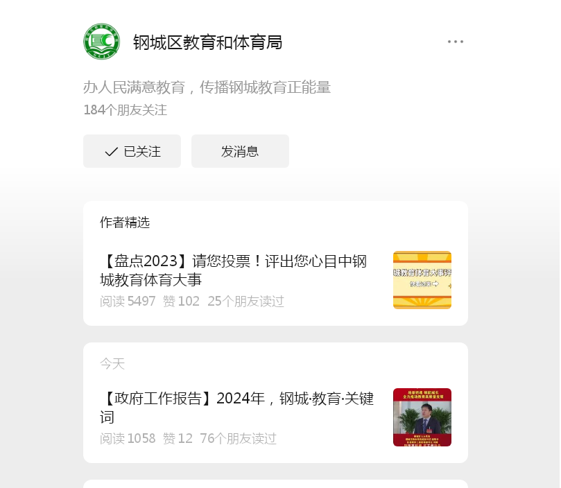 (四)政府信息公开平台建设情况。2023年我局通过“钢城区教育和体育局”官方微信平台推送教育信息198篇。网站政府信息公开统一通过济南市钢城区政府网站公开(网址:http://www.gangcheng.gov.cn/),可登录济南市钢城区政府网站,查询我局主动公开信息。